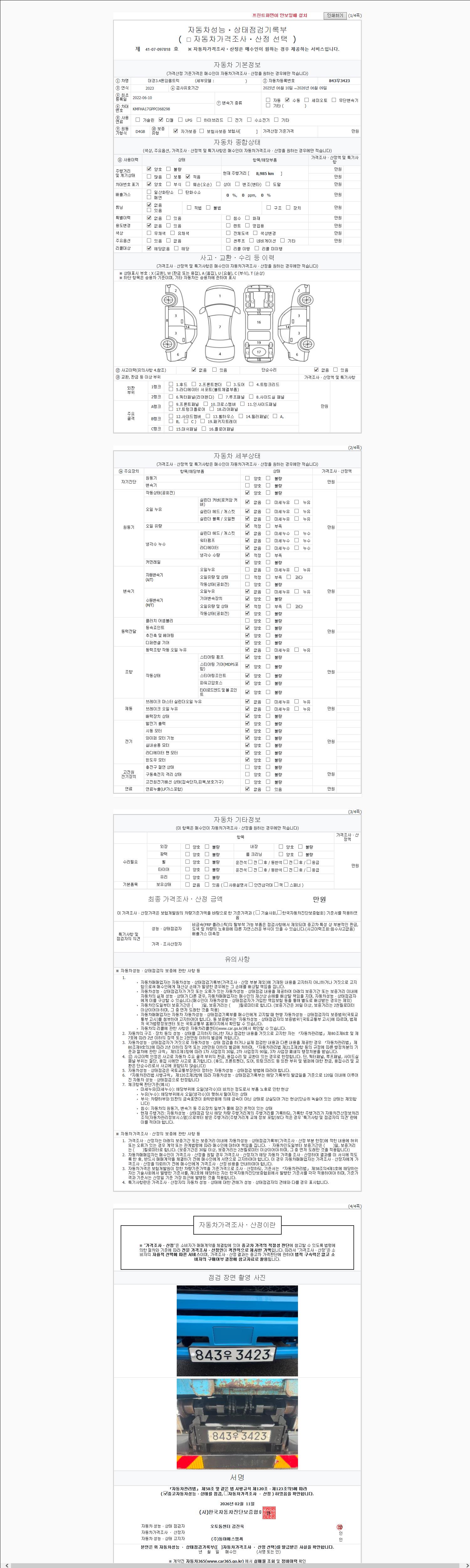 | 주행거리 | 8,985 km | 차량번호 | 843우3423 | 사고유무 | 성능기록부 참조 | 제시번호 | 제 2147483647 호 |