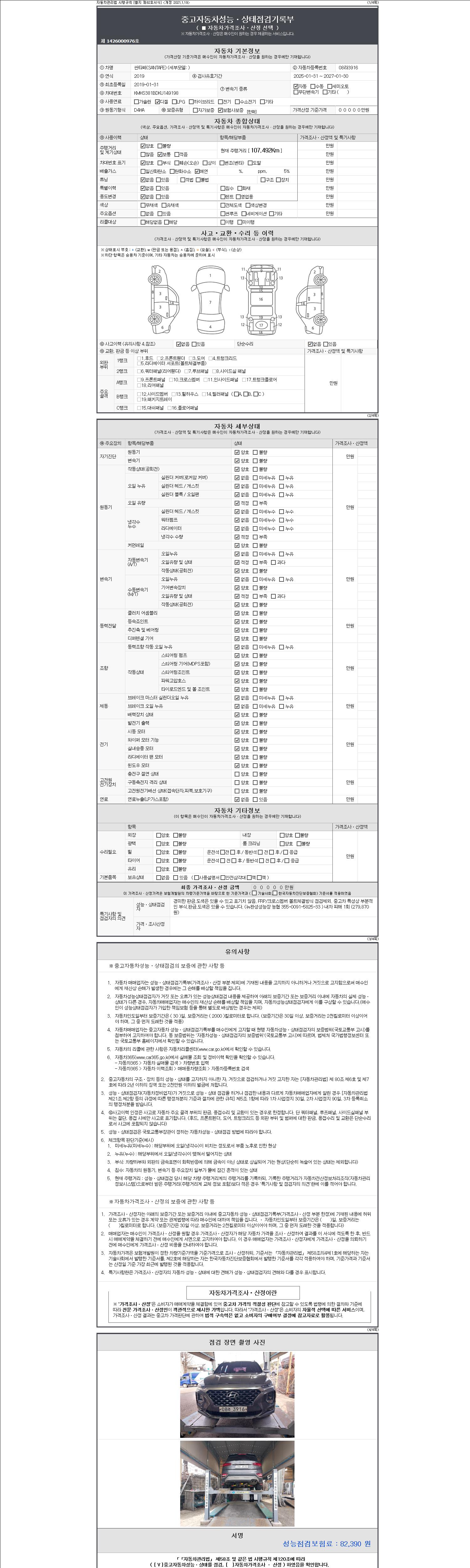 | 주행거리 | 107,492 km | 차량번호 | 08라3916 | 사고유무 | 성능기록부 참조 | 제시번호 | 제 2147483647 호 |