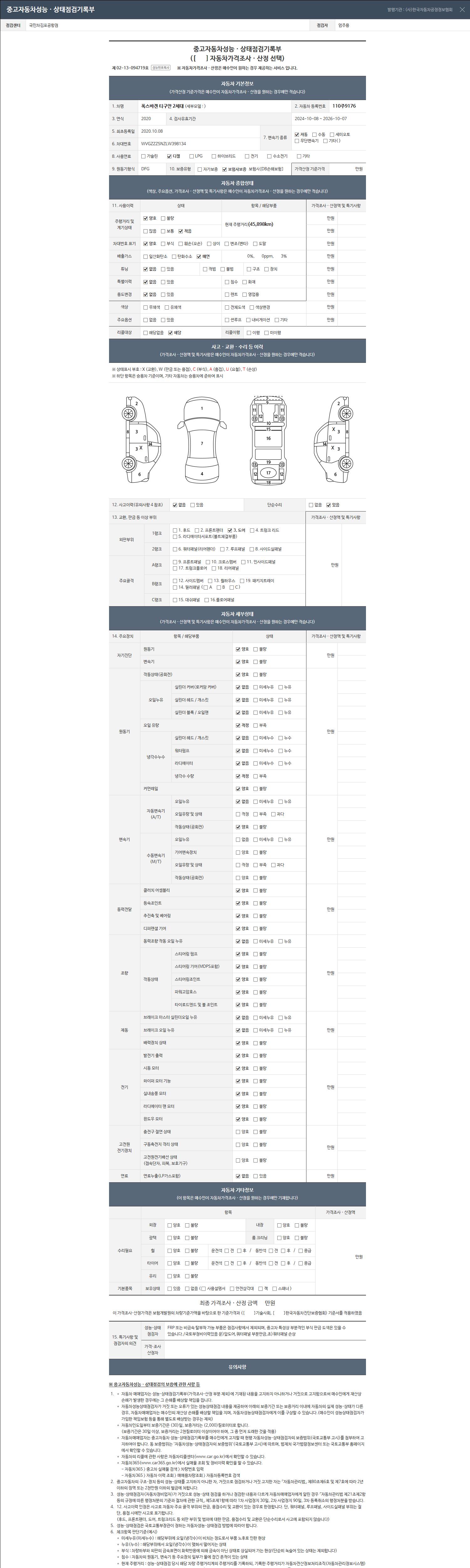 | 주행거리 | 45,898 km | 차량번호 | 110주9176 | 사고유무 | 성능기록부 참조 | 제시번호 | 제 2026064576 호 |