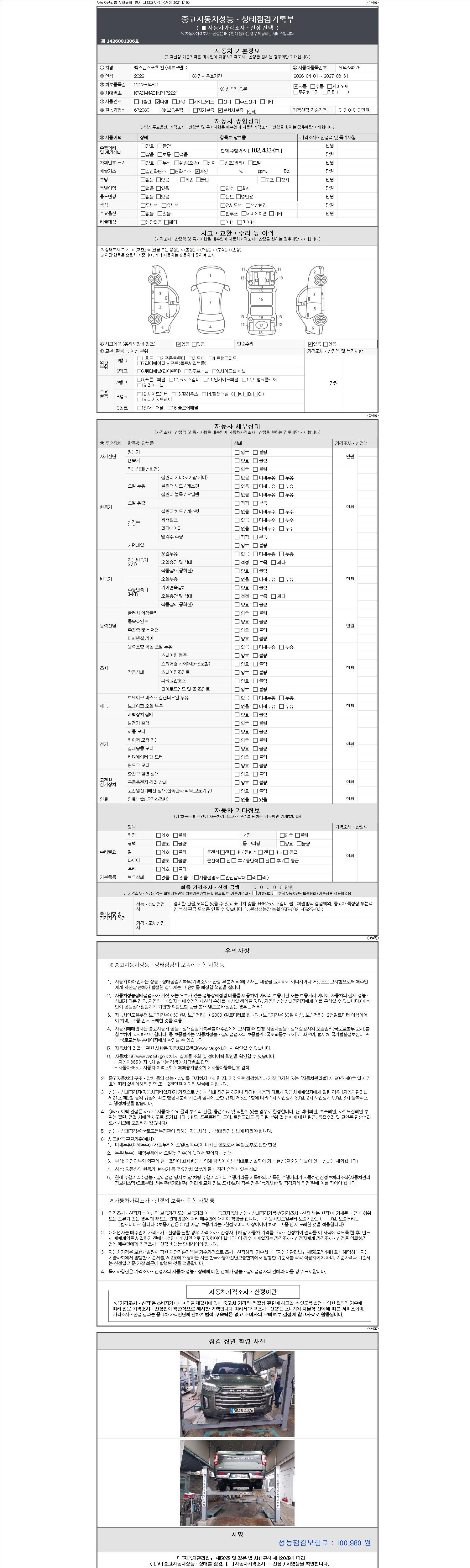 | 주행거리 | 102,433 km | 차량번호 | 804라4376 | 사고유무 | 성능기록부 참조 | 제시번호 | 제 2147483647 호 |