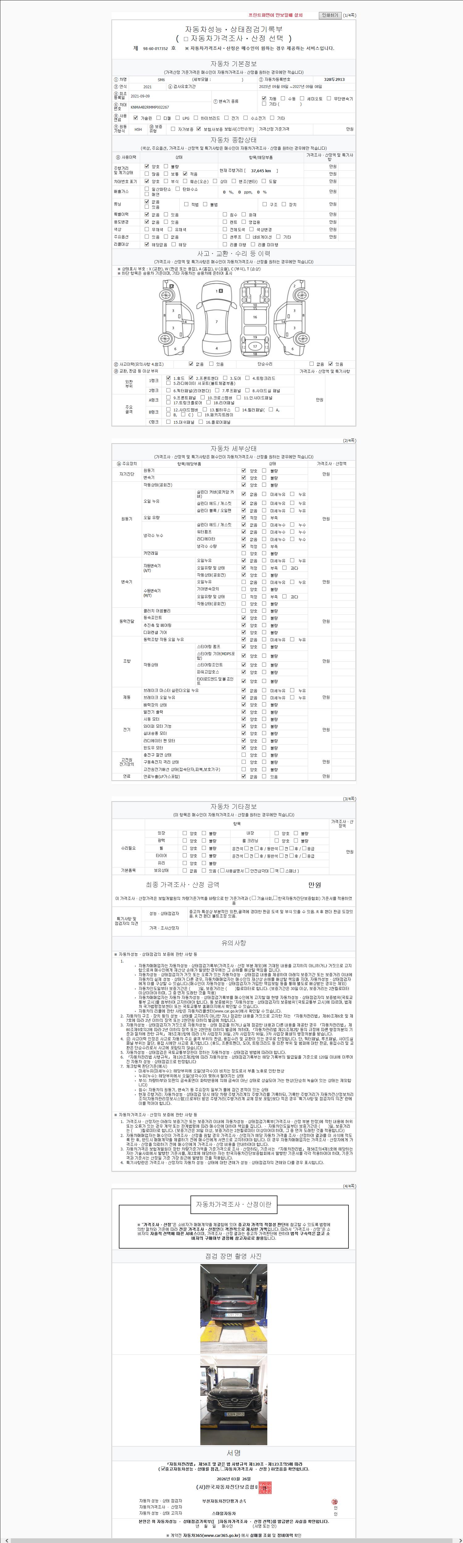 | 주행거리 | 37,580 km | 차량번호 | 328두2913 | 사고유무 | 성능기록부 참조 | 제시번호 | 제 2026056484 호 |