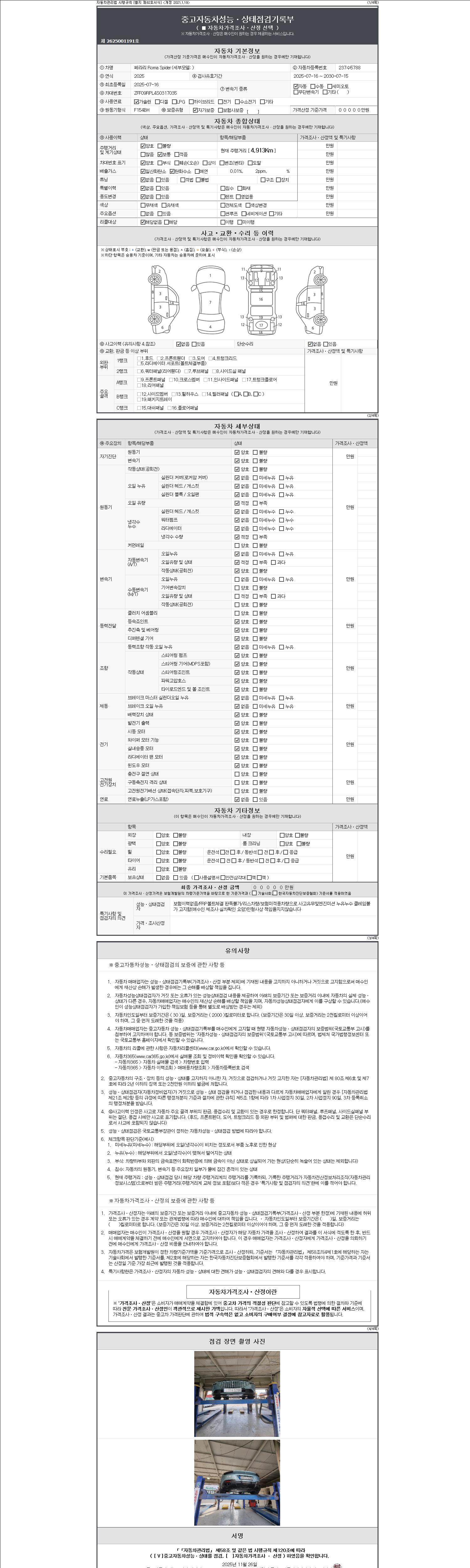 자동차관리법 시행규칙 제120조의 규정에 따라 별지 제 82호서식 《중고자동차 성능, 상태점검 기록부》를 발행한 성능, 상태점검자 및 매매자는 아래의 보증기간 또는 보증거리 이내의 중고자동차, 성능점검 기록부에 기재된 내용과 자동차의 실제 성능, 상태가 다른 경우 계약 또는 관계법령에 따라 매수인에 대하여 책임을 집니다.
