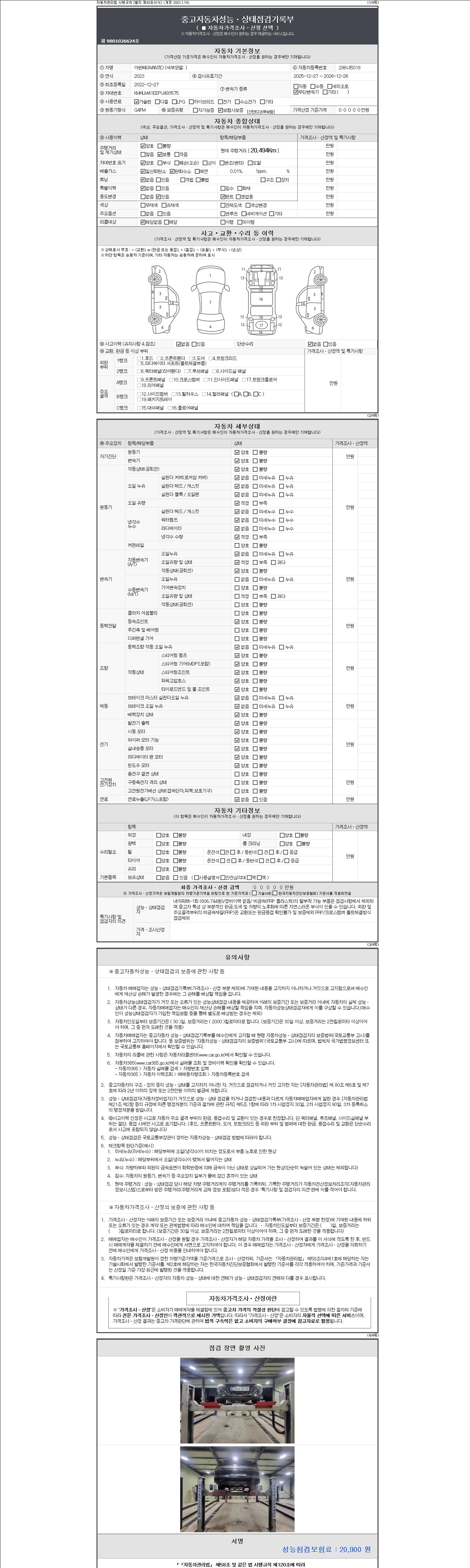 | 주행거리 | 20,494 km | 차량번호 | 296너5018 | 사고유무 | 성능기록부 참조 | 제시번호 | 제 2147483647 호 |