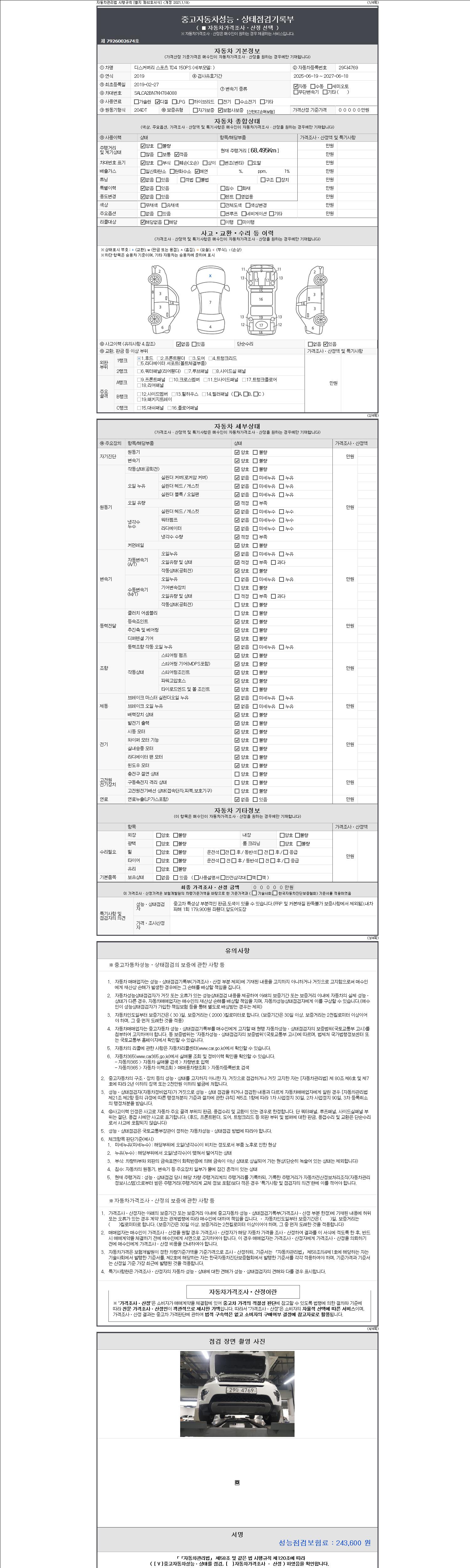 자동차관리법 시행규칙 제120조의 규정에 따라 별지 제 82호서식 《중고자동차 성능, 상태점검 기록부》를 발행한 성능, 상태점검자 및 매매자는 아래의 보증기간 또는 보증거리 이내의 중고자동차, 성능점검 기록부에 기재된 내용과 자동차의 실제 성능, 상태가 다른 경우 계약 또는 관계법령에 따라 매수인에 대하여 책임을 집니다.