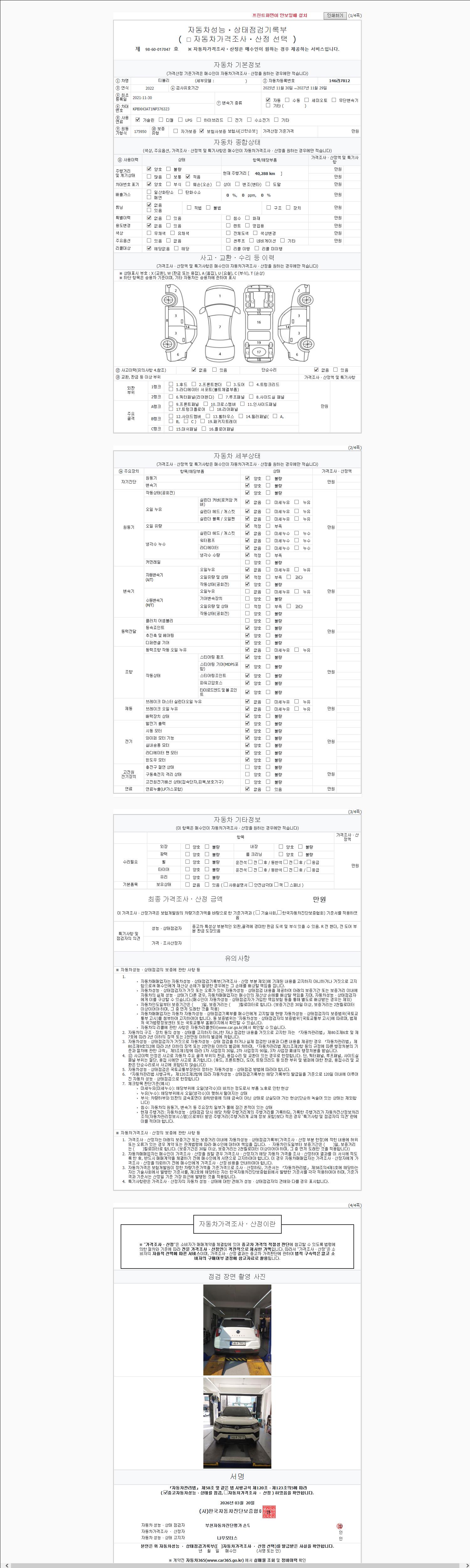 | 주행거리 | 40,200 km | 차량번호 | 146라7812 | 사고유무 | 성능기록부 참조 | 제시번호 | 제 2026051732 호 |