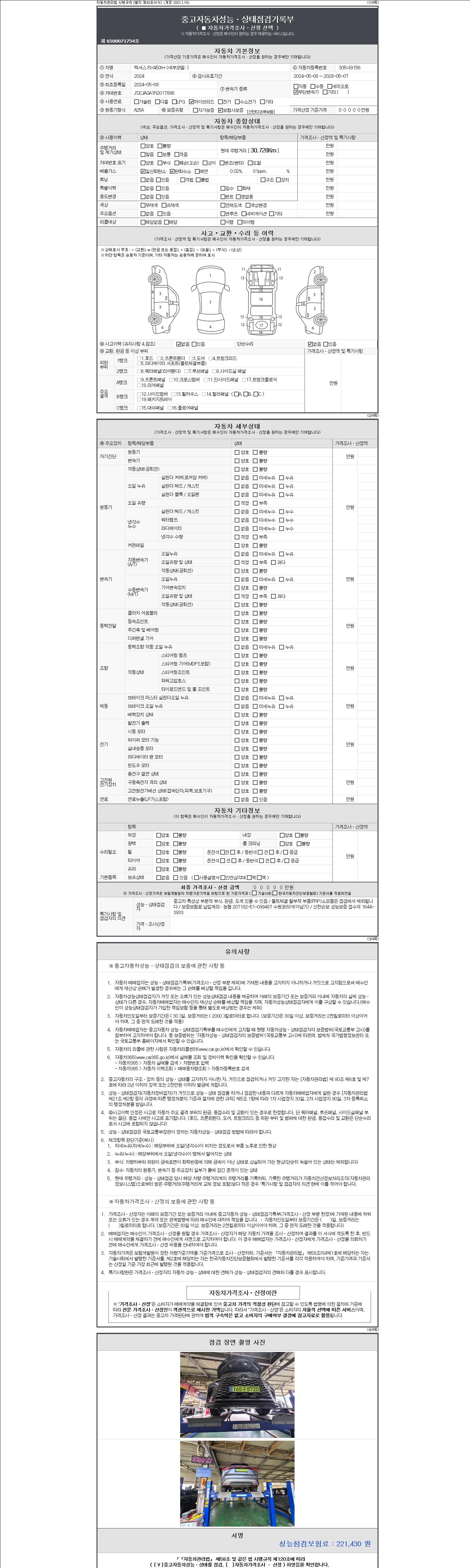 | 주행거리 | 30,728 km | 차량번호 | 305너9156 | 사고유무 | 성능기록부 참조 | 제시번호 | 제 2147483647 호 |