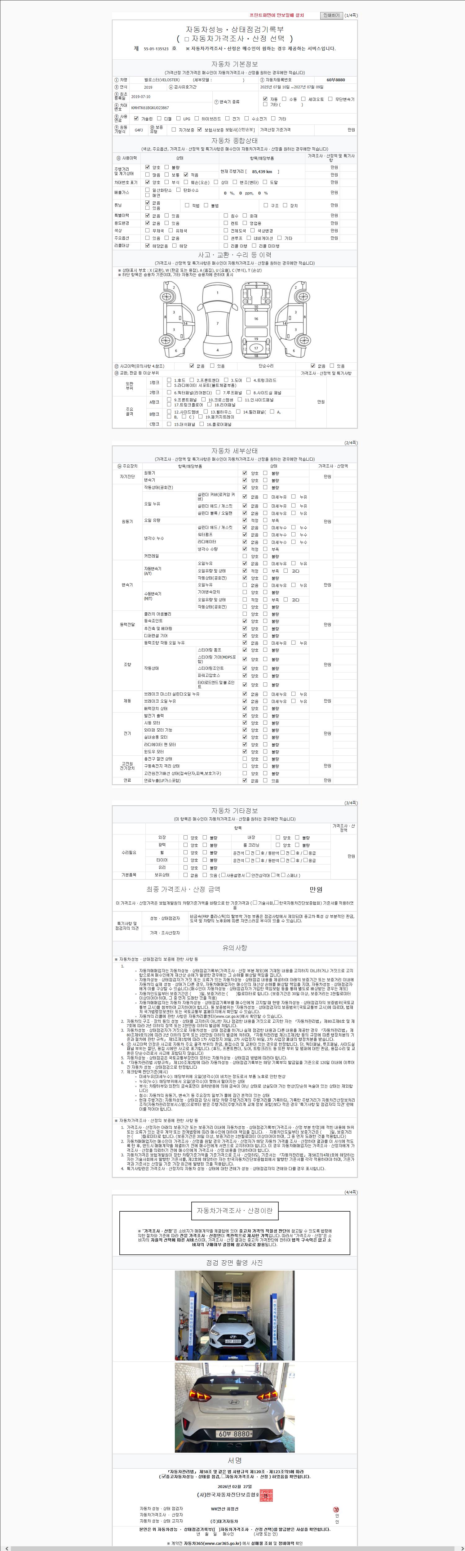 | 주행거리 | 85,437 km | 차량번호 | 60부8880 | 사고유무 | 성능기록부 참조 | 제시번호 | 제 2147483647 호 |